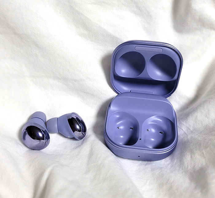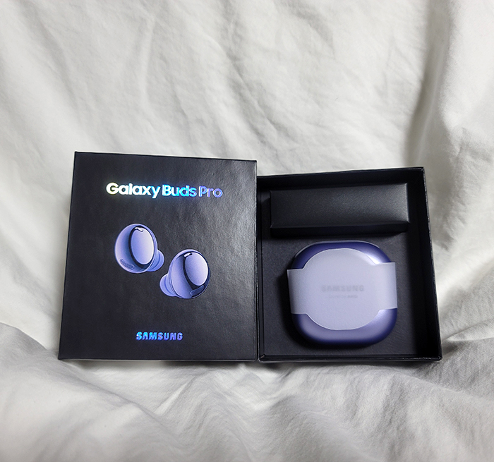 이번 갤럭시 런칭 시리즈의 메인 컬러인 바이올렛 색상. 정말 눈을 확 사로잡는 색상이다. 버즈 라이브와 같이 둥근 정사각형 모양의 케이스를 유지해서 버즈라이브와 커버 호환이 가능하다.
