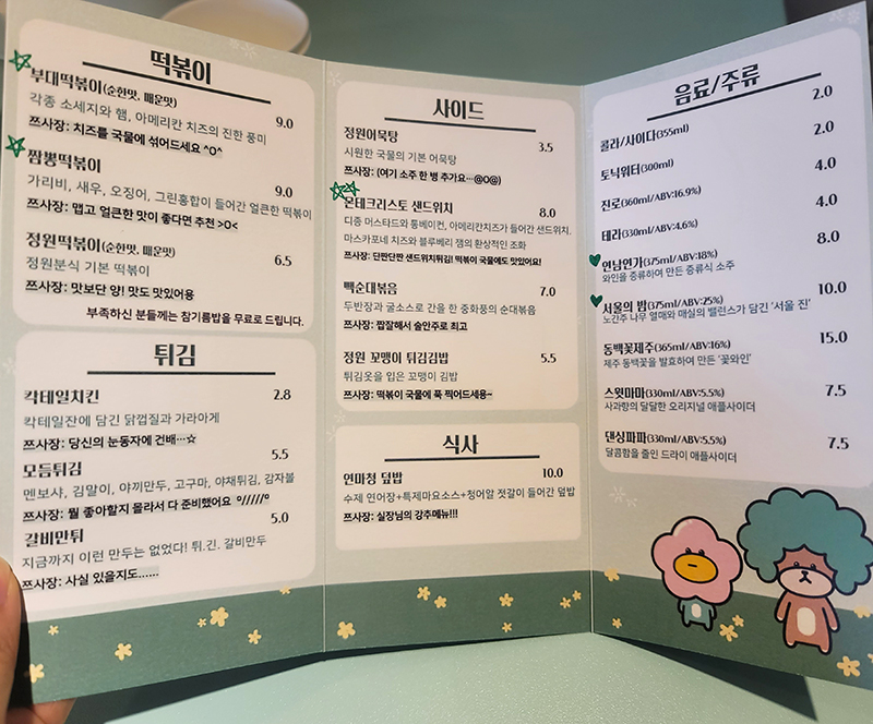 떡볶이가 메인인 분식집인데 사이드 메뉴나 곁들일 메뉴들이 생각보다 다양하다! 또 술 메뉴도 직접 아이디어를 낸 건지 설명이 색다르다 ㅎㅎ