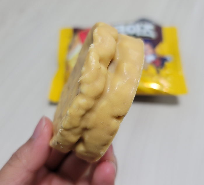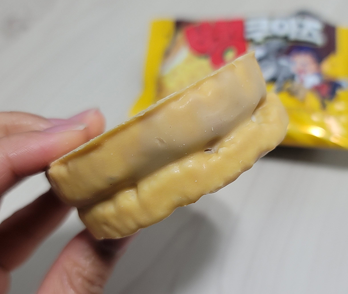 인절미맛 크림을 품고 있는 샌드 과자이다