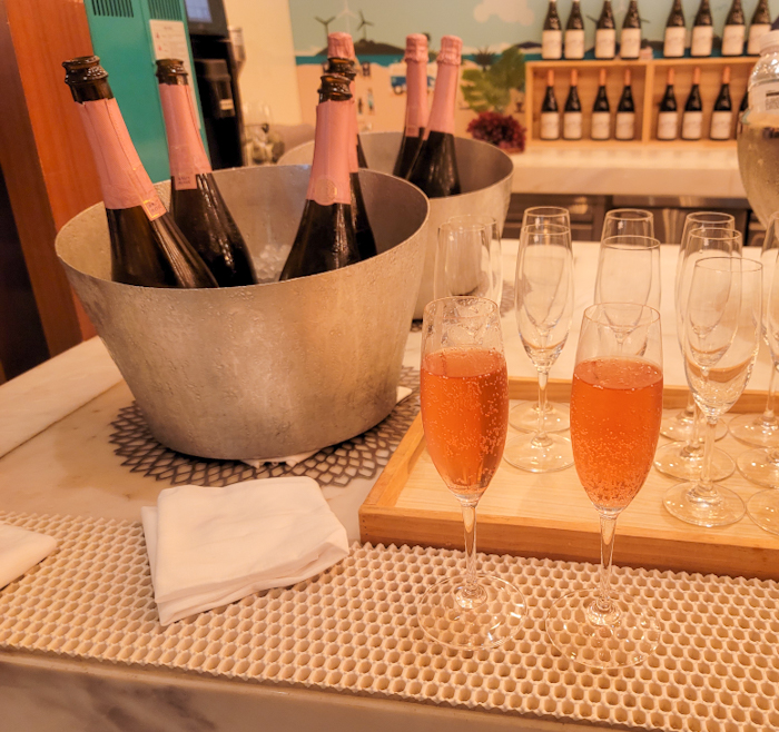 음료 칸 쪽에 한잔씩 따라갈 수 있는 스파클링 와인이 있었다