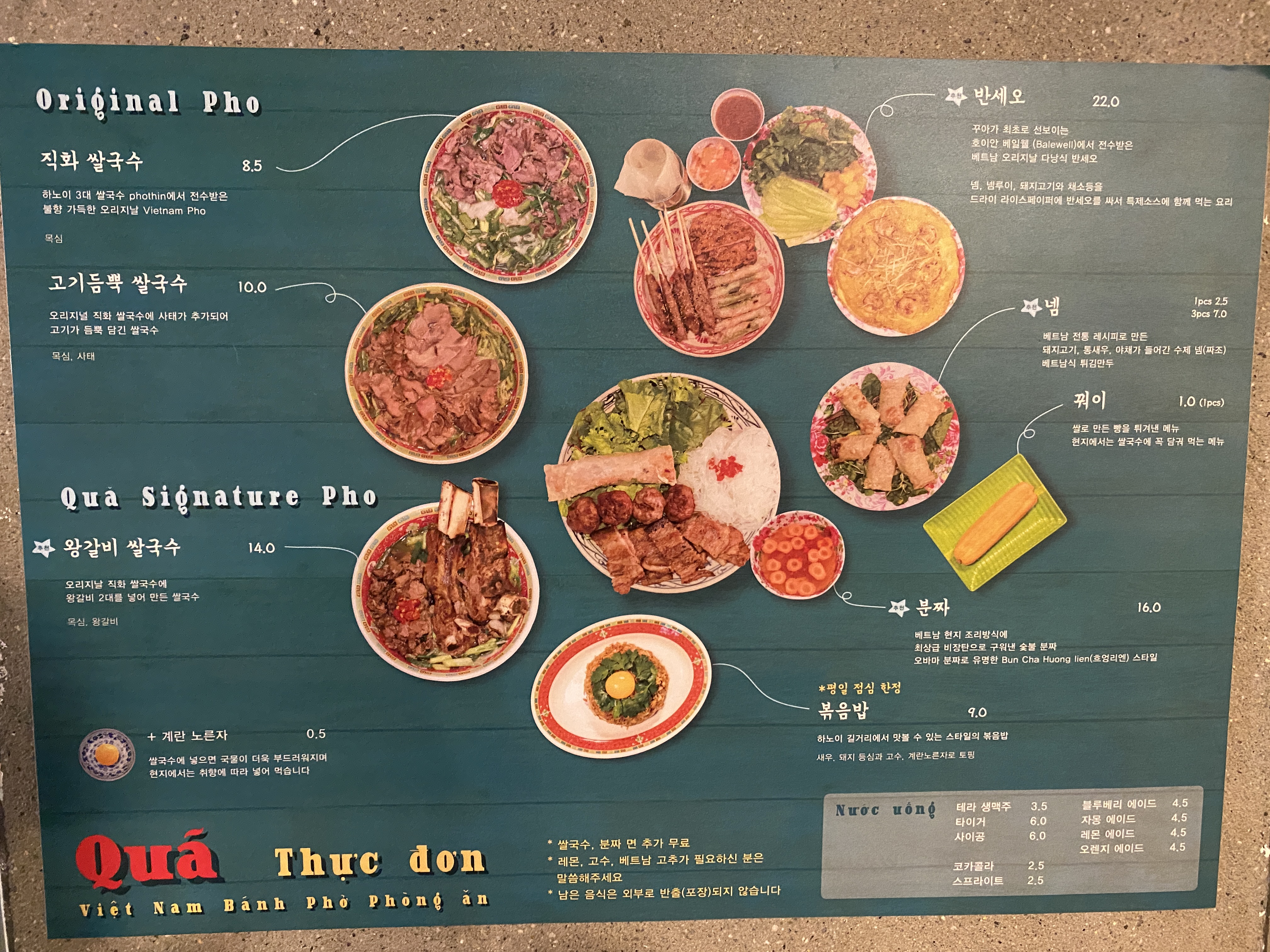 성수동 맛집 꾸아의 메뉴중 특이하게 왕갈비 쌀국수가 있었다. 쌀국수에 정말 큰 왕갈비 2대가 함께 나와 이색적인 메뉴이자 메인메뉴같았다. 반세오도 인기메뉴인지 우리가 주문하고 몇팀 뒤에 재료소진으로 주문마감을 했다.