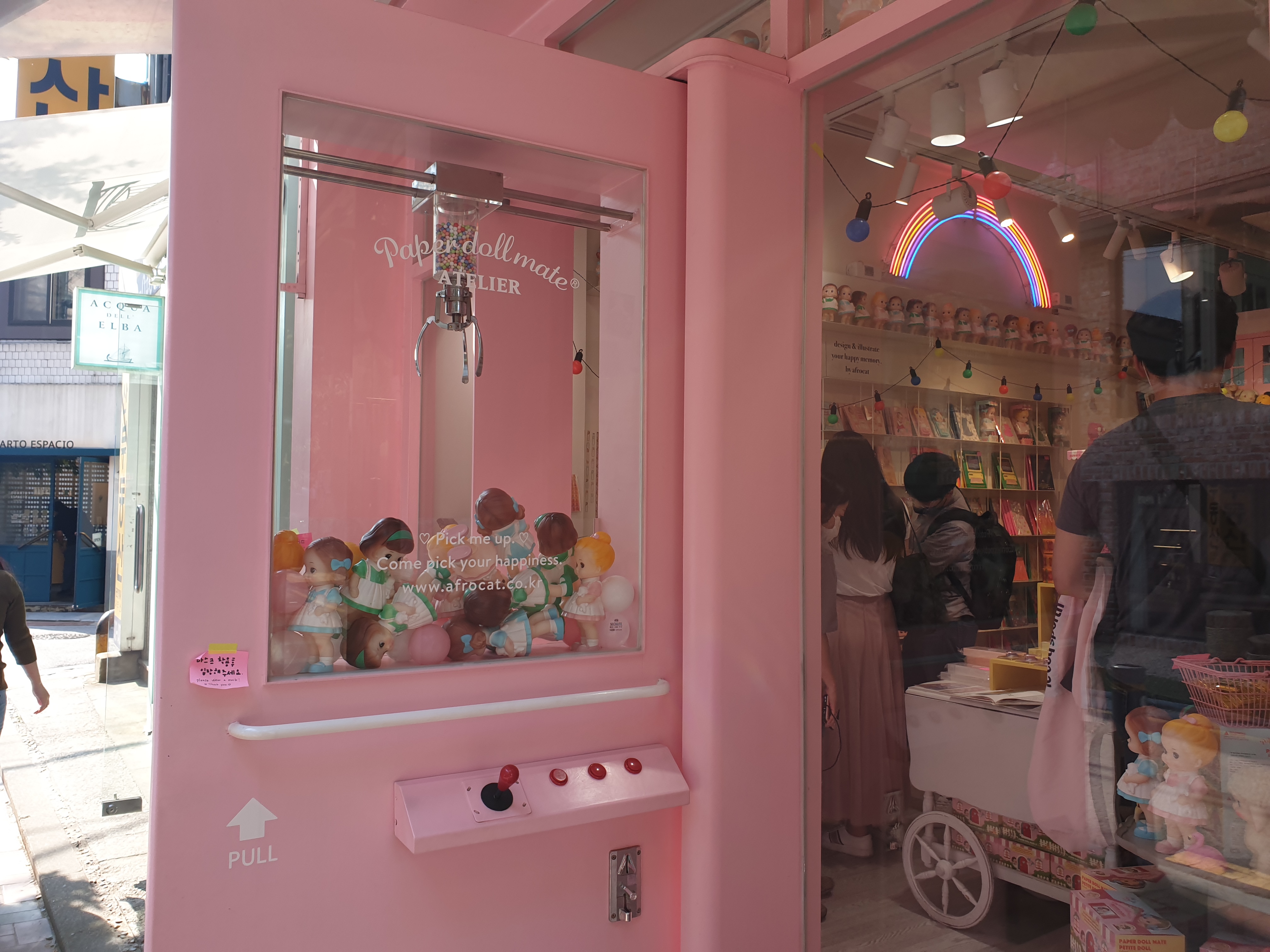 구경중에 핑크색 소품샵이 있어서 들어가봤다. 페이퍼돌 메이트 아틀리에 소품샵은 문이 특이하게 인형뽑기기계 컨셉으로 되어있다. 여러 소품들과 인형, 스티커, 악세사리 등을 팔고있었다.