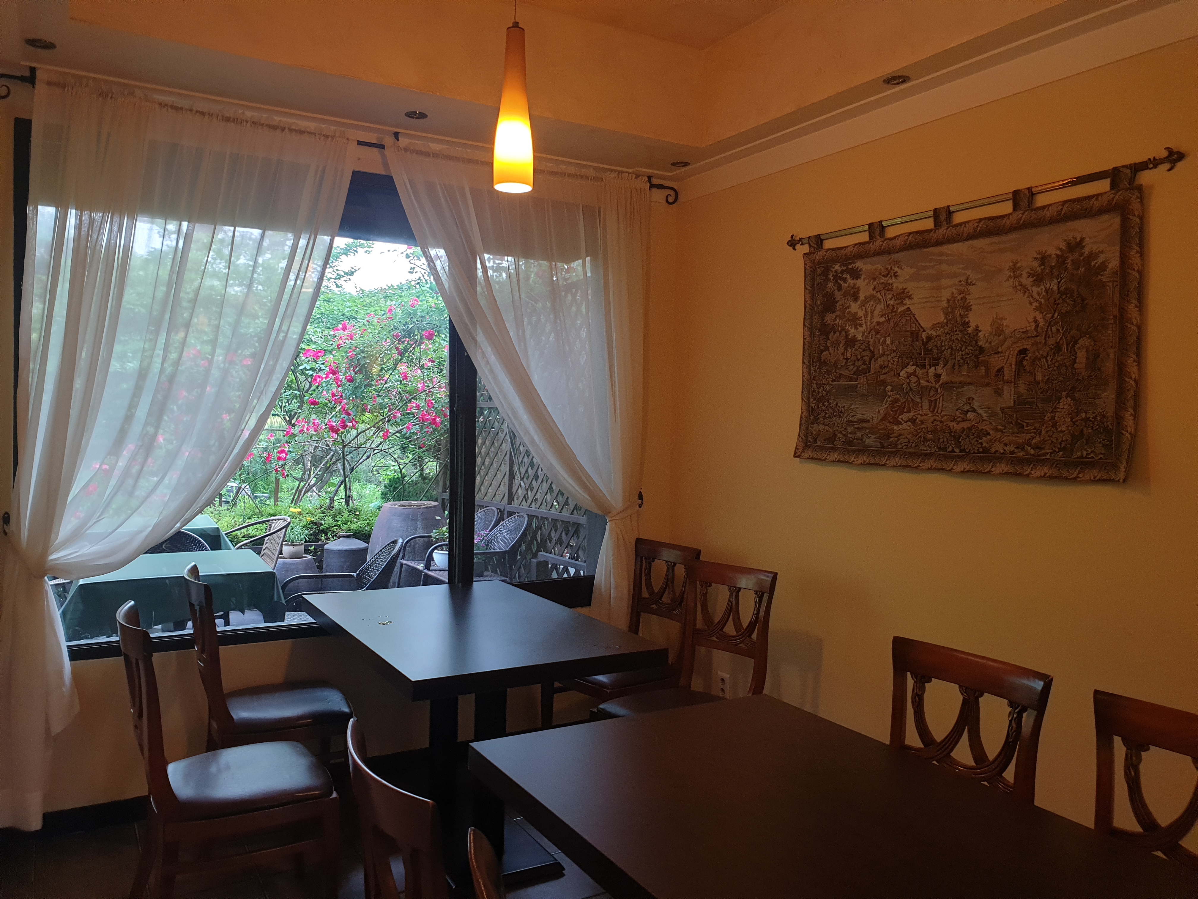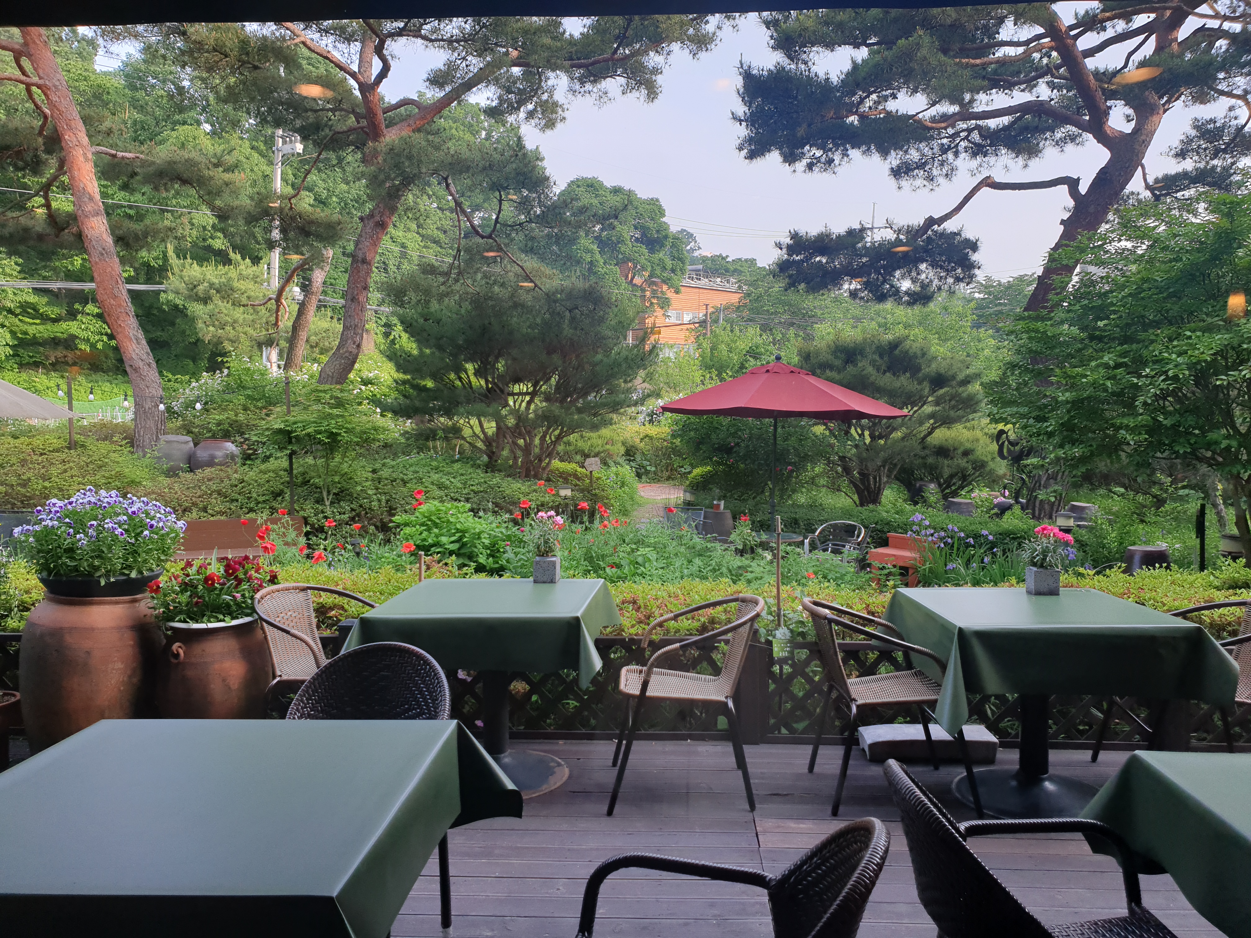 내가 좋아하는 자리에서 보이는 한스케익 테라스와 미니 정원 뷰 ㅎㅎ 바깥쪽 테라스도 정말 예쁘게 꾸며져있고 조그맣게 정원이 다양한 꽃들로 조성되어있어 한번쯤 나가서 구경해도 좋다.