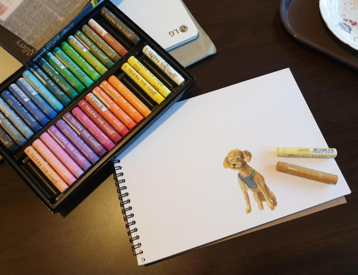 분위기가 너무 좋고 한적하니 좋아서 혼자 또 노트북과 오일파스텔을 챙겨 갔었다. 혼자 넓은 테이블에 앉아 한적한 분위기속에서 그림을 그리며 예쁜 정원 한번 바라보며 제대로 힐링하고 온듯하당. 종종 가까운 카페가 질릴때, 혼자 조용히 시간을 보내고싶을때 딱인 카페같다. 한스케익 과천점 추천!!~