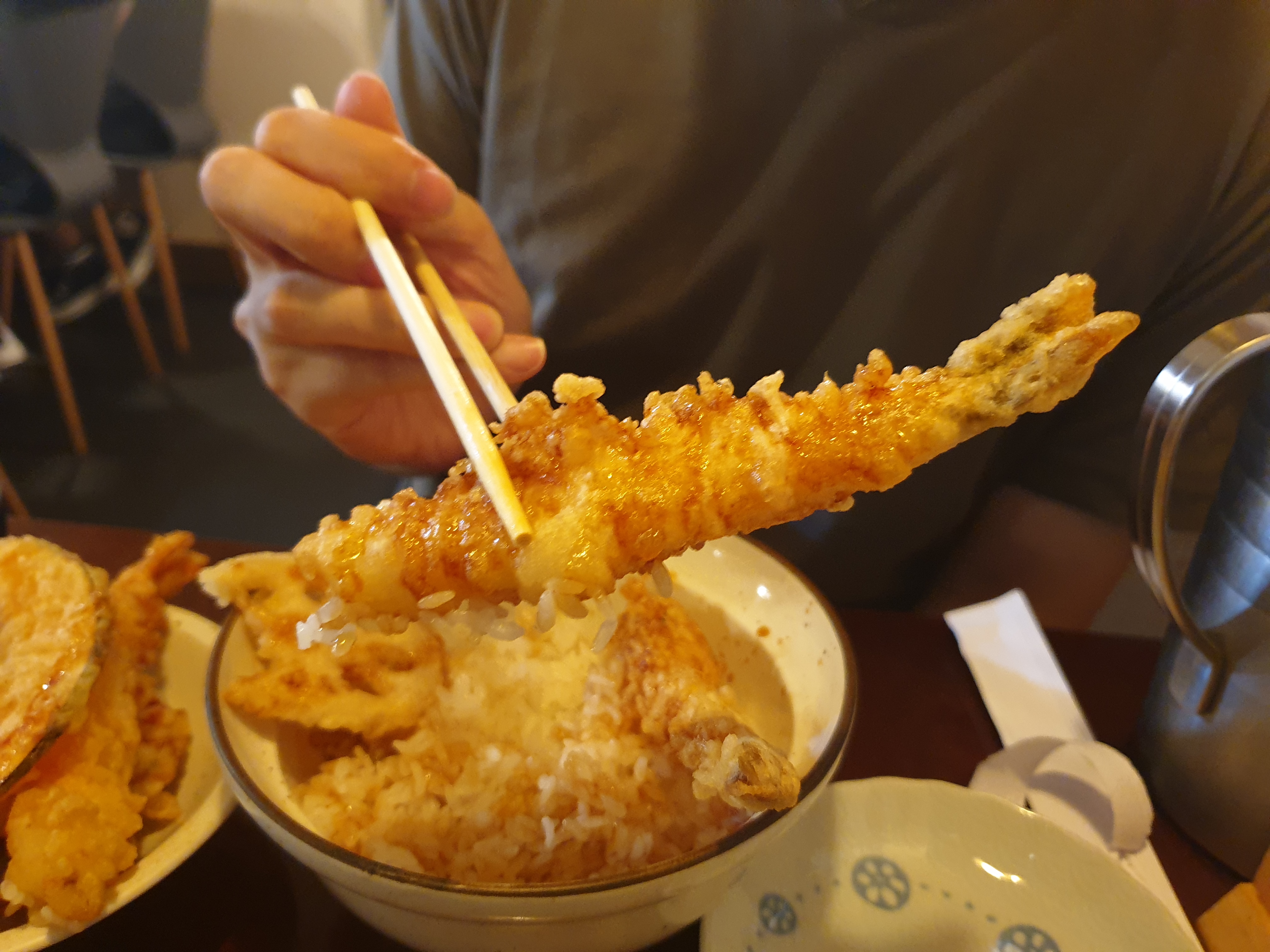 나와 남자 친구 둘 다 에비죠 텐동을 시켰다. 근데 나온 튀김을 살펴보니 오잉 오징어가 있네? 잘못 들어갔나? 개이득!! 하려다가 버섯이 없는 걸 발견하곤.. 아 버섯 대신 오징어를 넣어줬나? 아니 이렇게 구성을 맘대로 바꿀 거면 시킬 때 말을 해줘 야한 거 아닌가.. 버섯이 다 떨어졌다거나... 오징어로 대체해도되겠냐거나.. 오징어도 맛있고 좋으니 별말 안 했지만 만약 다른 튀김이었다면?? 새우가 하나 적었다면..? 뭔가 좀 읭 스러웠지만.. 넘어갔다.