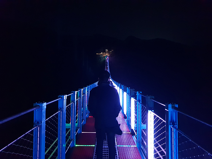 출렁다리 도착!! 정말 주변에 아~~~무것도 안보였다. ㅎㅎㅎㅎ 야간의 묘미랄까... 정말 주변에 아무것도 안보여서 지금 여기가 산위인지 이 출렁다리가 공중에 떠있는게 맞는지 의심될정도..ㅎㅎ 그래도 낮에는 볼수없는 출렁다리의 멋진 조명!! 화려한 조명이 소금산을 감싸네!! 다리 조명 색상이 계속 바뀌면서 화려한 연출을 내었다.