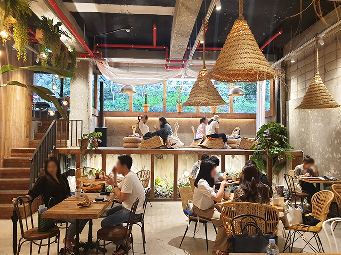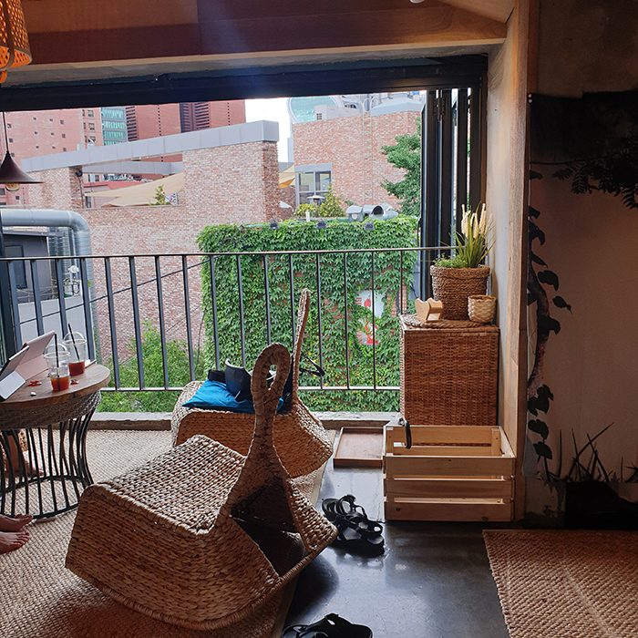 아무래도 신상카페고 라탄제품으로 꾸며진 동남아식 카페라 사람들이 많이 찾고 북적여서 조용~히 이 분위기를 즐기기엔 힘들지만 그럼에도 야외 자리와 구석구석 창가자리 맨윗층의 다락방 느낌의 좌식 까지 넘나 구석구석 스팟이 많아서 종종 찾을거 같다-