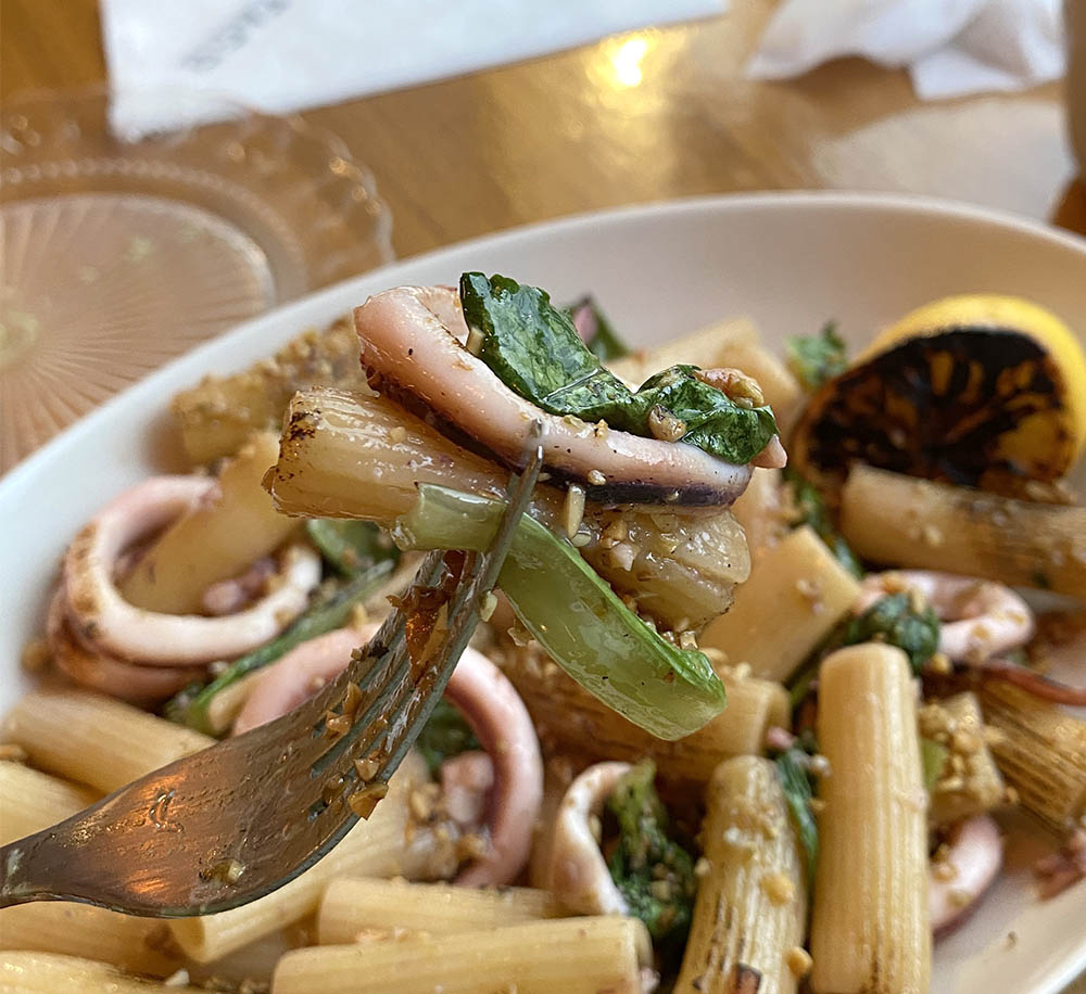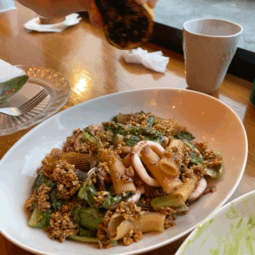 적당한 짭쪼름함과 오징어와 버터의 고소함이 물씬~ 딱 와인이 생각나는 그런 메뉴였다. 색다른건 맛은 아니지만 계속 손이가는 그런맛~! 하지만 난 고수 파스타에 너무 마음이 뺏긴 나머지.. 오징어 리가토니에겐 큰 감동을 얻지 못했다. ㅠㅠ
