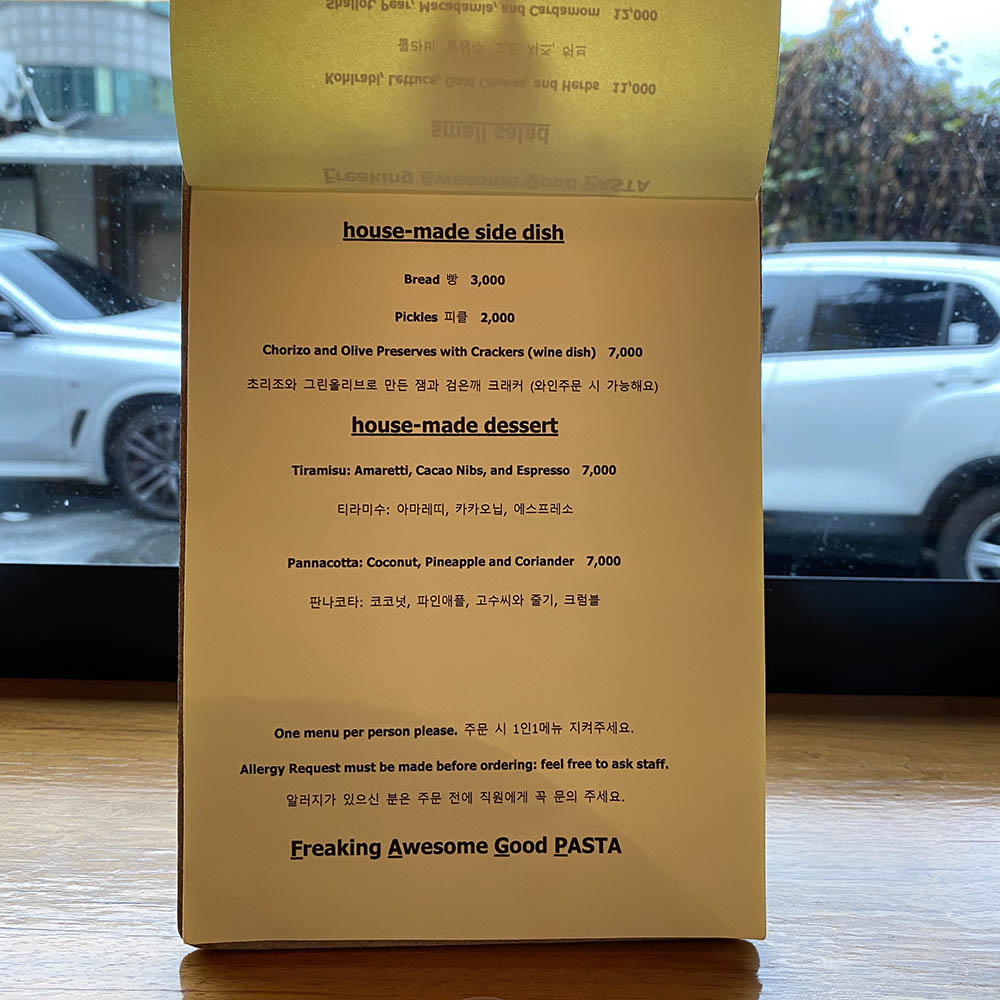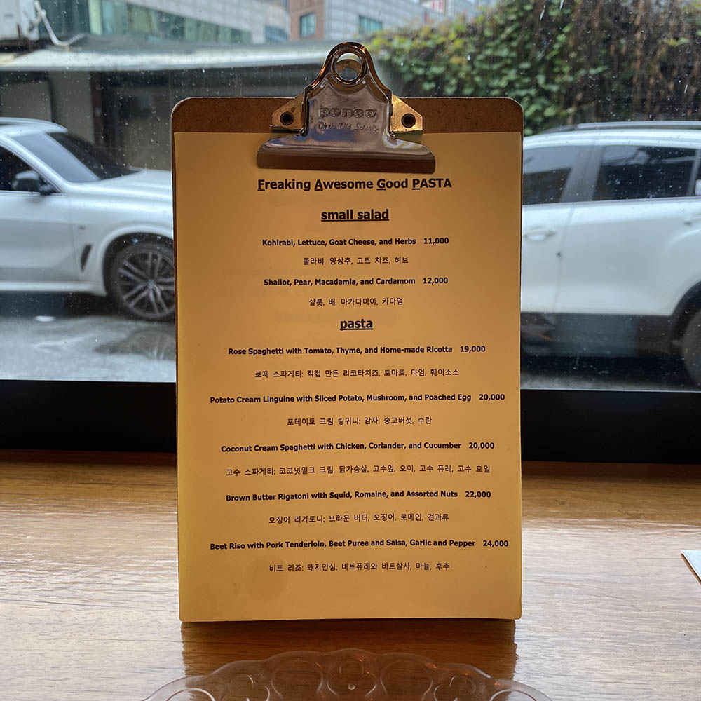 알아보니 미쉐린 가이드 2019, 2020을 연달아 선정된 파스타 전문점이다. 대중적인 파스타 장르를 팩피만의 창의적인 감성으로 풀어낸 간결하면서도 개성 넘치는 메뉴를 선보인다고 한다. 그래서 인지 메뉴들이 다 개성 넘쳤고 색달랐다.