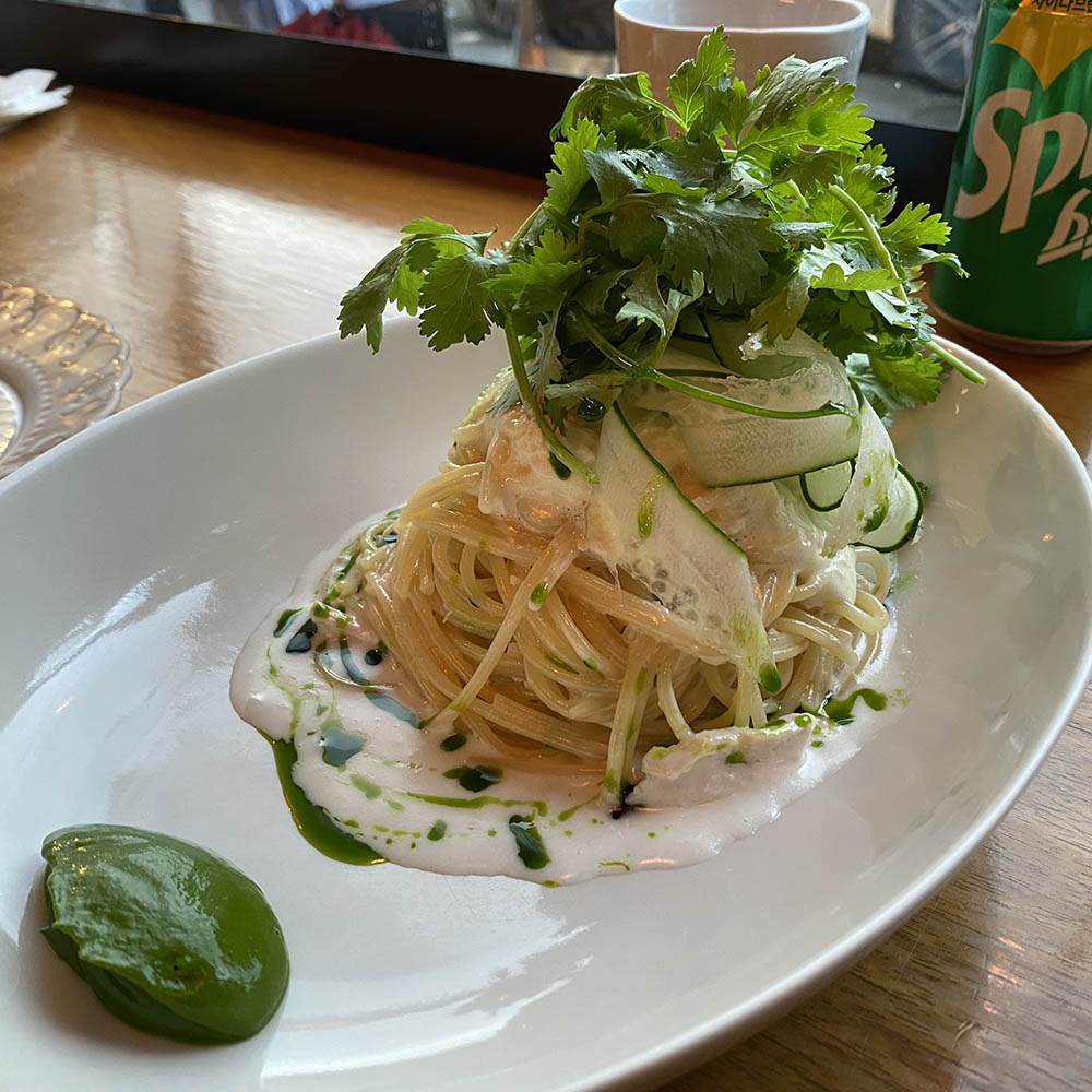 고수를 좋아해서 쌀국수나 마라탕 먹을때 꼭! 빼먹지 않고 먹는데 고수파스타는 과연 어떨까? 안어울리진 않을까 약간의 의심과 함께 음식 설명을 듣고 열심히 비볐다! 고수 퓨레와 면을 전체적으로 골고루 섞어 먹으라고 하셨다.