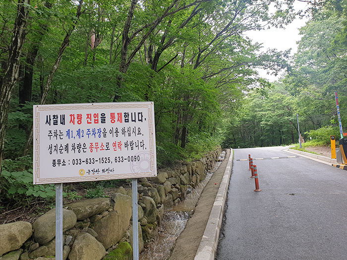 화암사나 란야원을 찍고 가면 되는데 밑에 제 1주차장 말고 제 2주차장까지 차를 끌고 올라오면 된다. 저 차량진입 통제 표지판 전에 옆으로 주차장 공터가 있다. 2 주차장에 세우게 되면 한 5분? 정도만 올라가면 금방 멋진 화암사 입구가 보인다