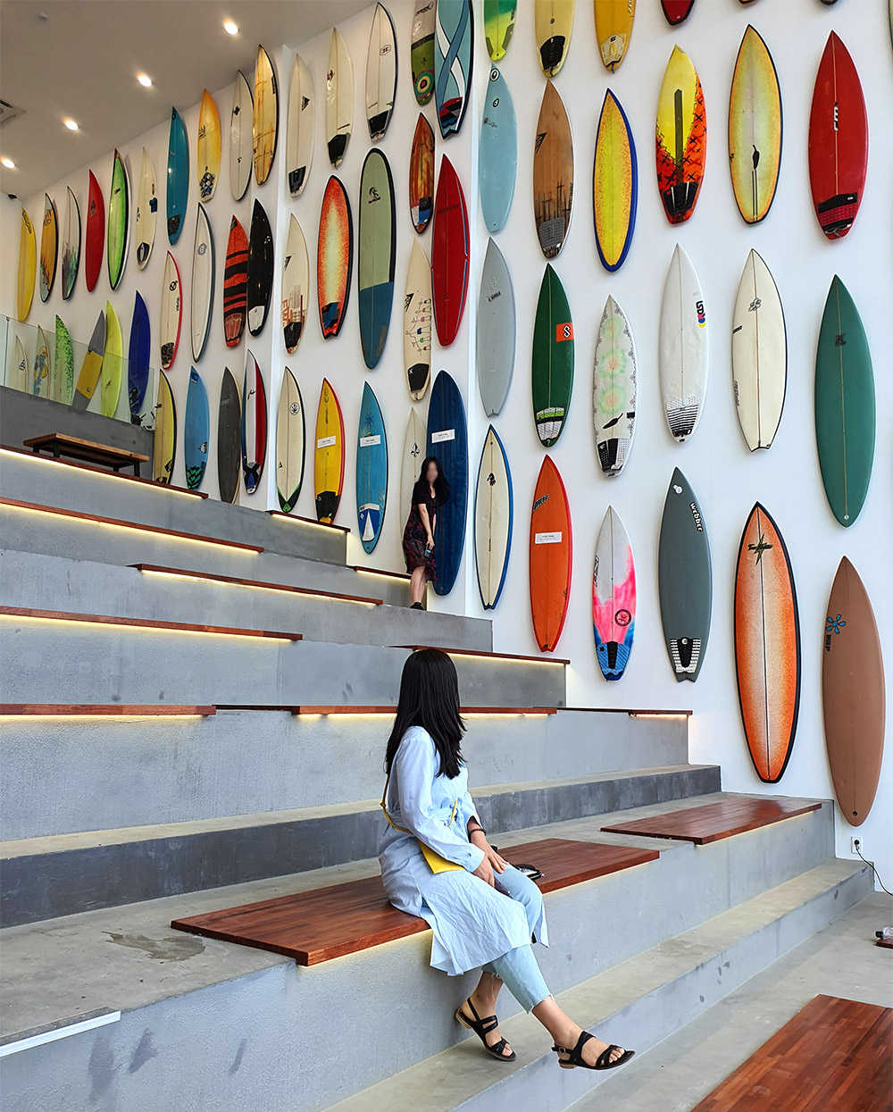 카페 2층으로 올라가는 계단을 계단식 자리로 앉을 수 있게 돼있고 그 벽면이 바로 그 핫한 서핑보드들로 꾸며진 벽이다. ㅎ 다들 벽 쪽으로 가 한 컷씩 찍어주고~ 계단도 다 올라가서 앞쪽 바다를 바라보며 한컷 찍어주고~