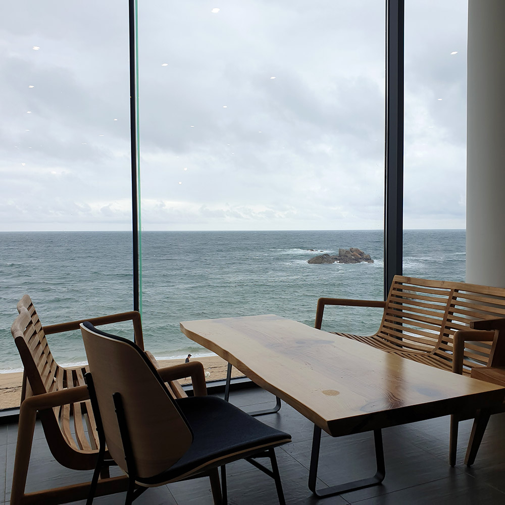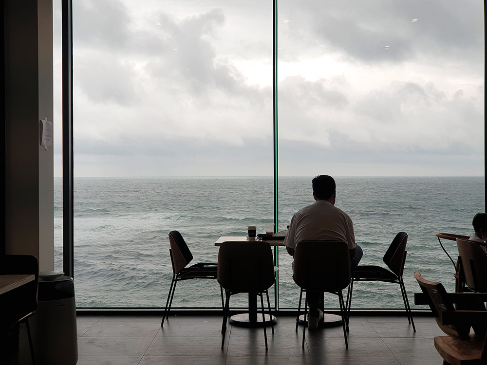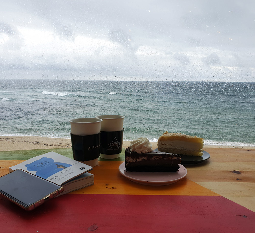 카페에 들어가자마자 건물 앞쪽으로 펼쳐지는 바다 ㅠㅠ 날씨 좋은 날 왔으면 정말 끝내 줬을 거 같다. 날씨 때문에 매우 거칠어진 동해바다..