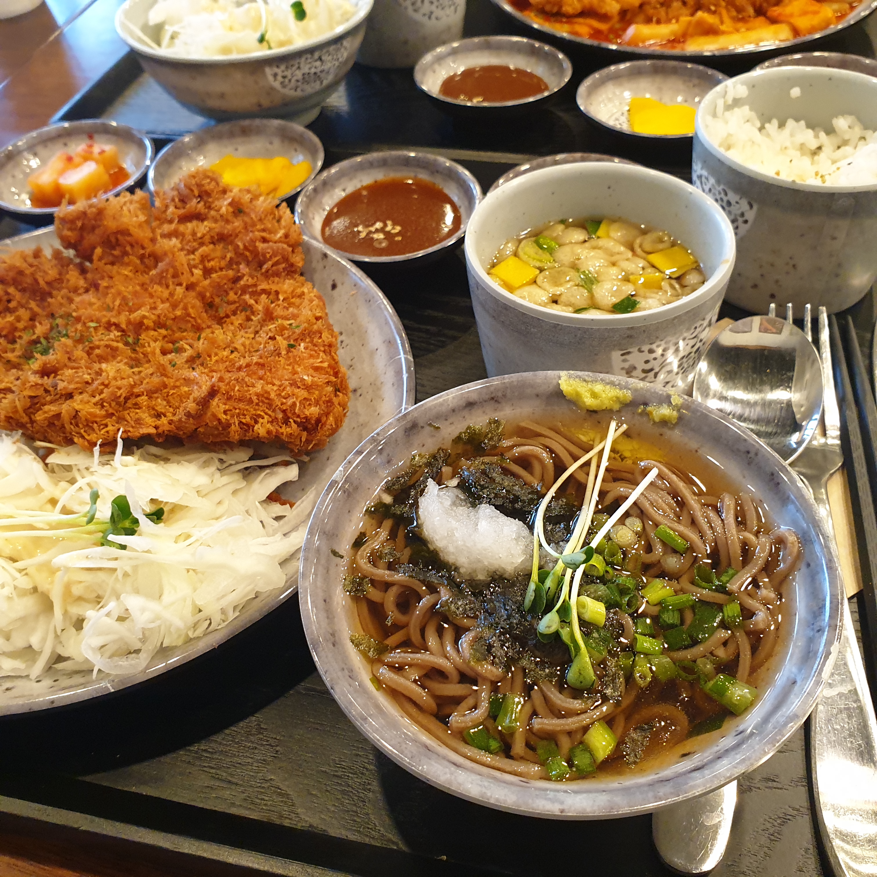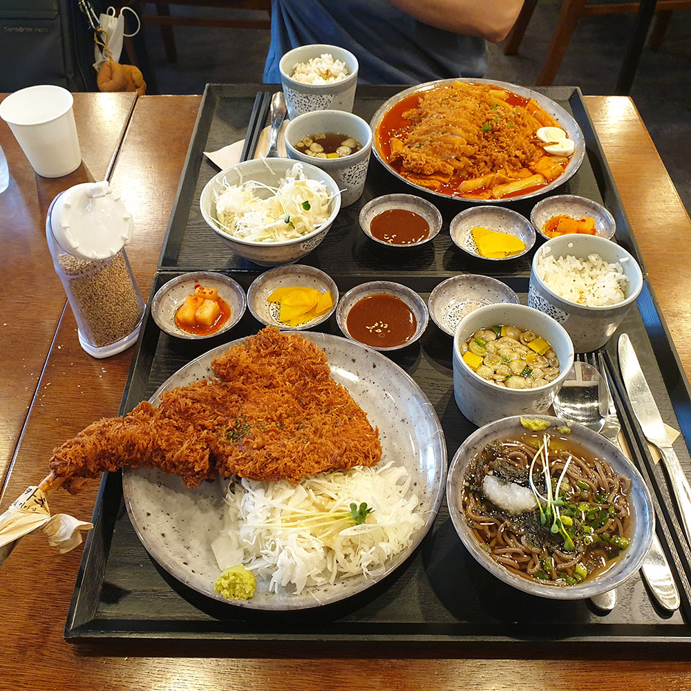 우리가 갔을 땐 치즈 카츠가 품절이라 아쉽게 시키지 못하고, 토마호크 카츠와 미니 소바, 떡볶이 위에 돈가스가 함께 나오는 떡볶카츠를 시켰다!