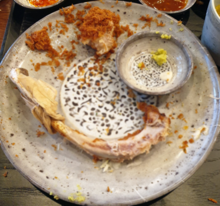 토마호크 카츠를 잘라먹다 보니 요렇게 뼈 부분만 남았는데 이게 또 별미다!! 설마 여기 뼈에 붙은 살 안 뜯어먹고 온 사람은 없겠지!? 살이 은근 많이 붙어있다! 정말 저거 뜯어먹고 오는 게 토마호크 카츠의 제일 중요한 부분이라고 해도 과언이 아님! 꼭 뼈들고 야무지게 뜯어먹고 오길!!