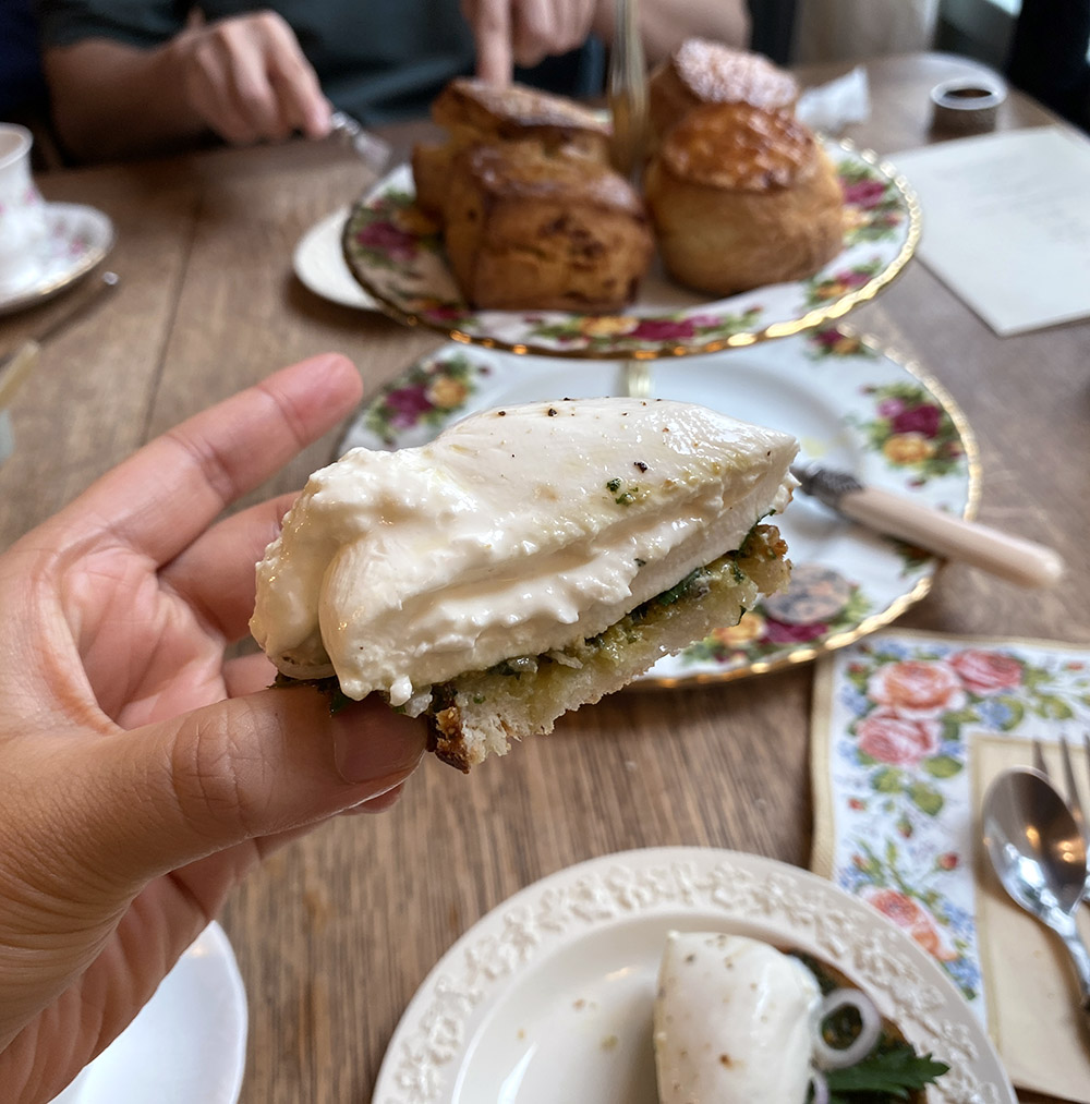갖다주시면서 바로 메뉴에 대해 설명해 주신다. 맨 밑에 우리가 미리 두종류 중 선택한 부라타 치즈 오픈샌드위치부터 스콘, 다쿠아즈 등등~ 다쿠아즈 크림이 녹으면 맛이 떨어질 수있으니 맨 위에 다쿠아즈 먼저 먹는걸 추천한다고 하셨다.