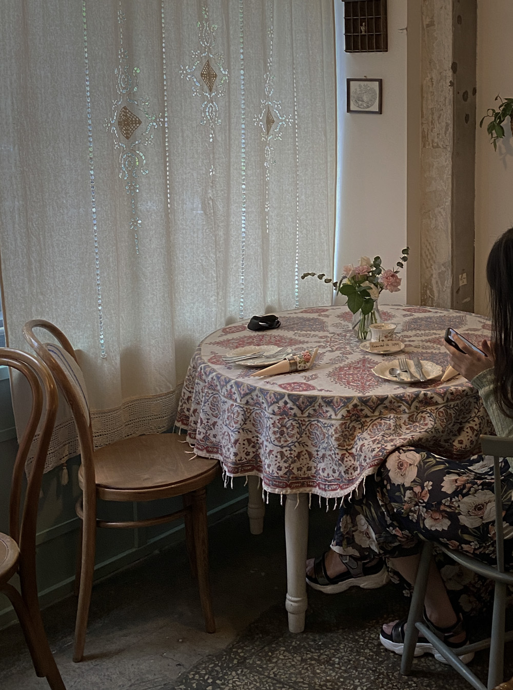 테이블 마다 예쁜 식탁보가 깔려있는곳이 있고 아닌 테이블이 있었는데, 요요 동그란 테이블에 식탁보가 너무 예뻤다 ㅠㅠ 진짜 갬성갬성~ 빈티지스럽고 소녀감성 같은..