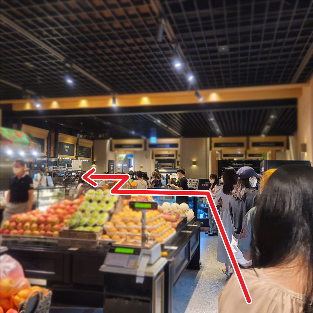 갔더니 과일코너 근처를 크게 둘러 줄이 서있었다.. 띠용! 바닥에 아예 저기까지 스티커가 붙여있다. 코로나로 인한 거리두기 꼭꼭 유지하기~!